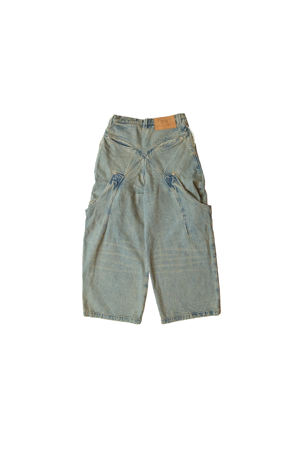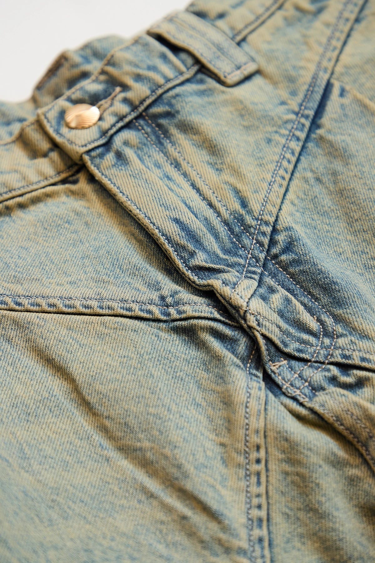 The Namesake Billie Bibs Denim Pants featuring a baggy relaxed-fit, full cropped leg, mid rise, pleated detail waistband, and four pocket styling.