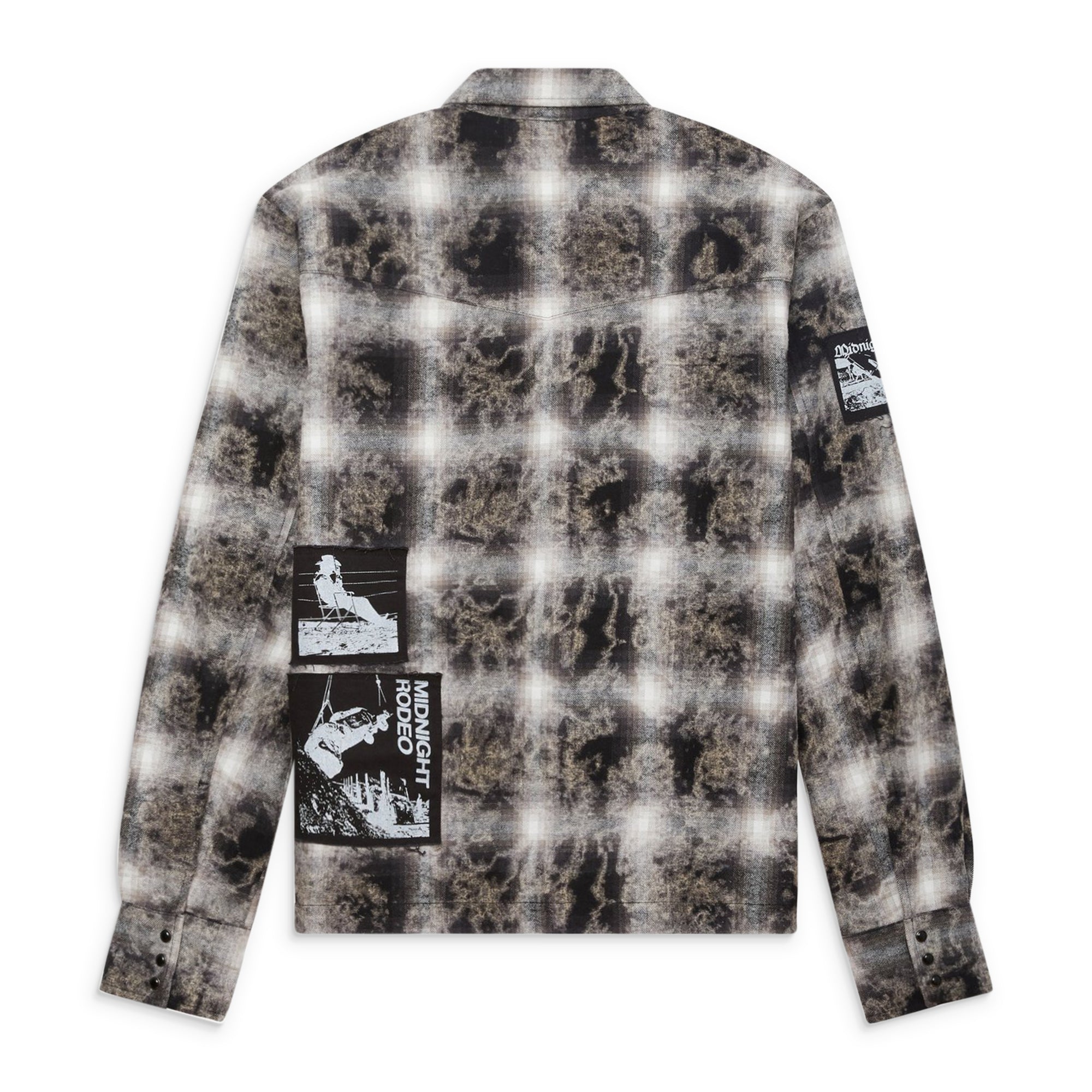 Acid-washed cotton flannel engineered with patchwork paneling and intentional distressing throughout. The relaxed button-down silhouette and classic collar maintain familiar shirting proportion, while layered surface treatments and tonal variation deepen visual texture. Soft, worn-in hand feel and everyday ease merge with expressive patterning for a casual piece with nuanced character.