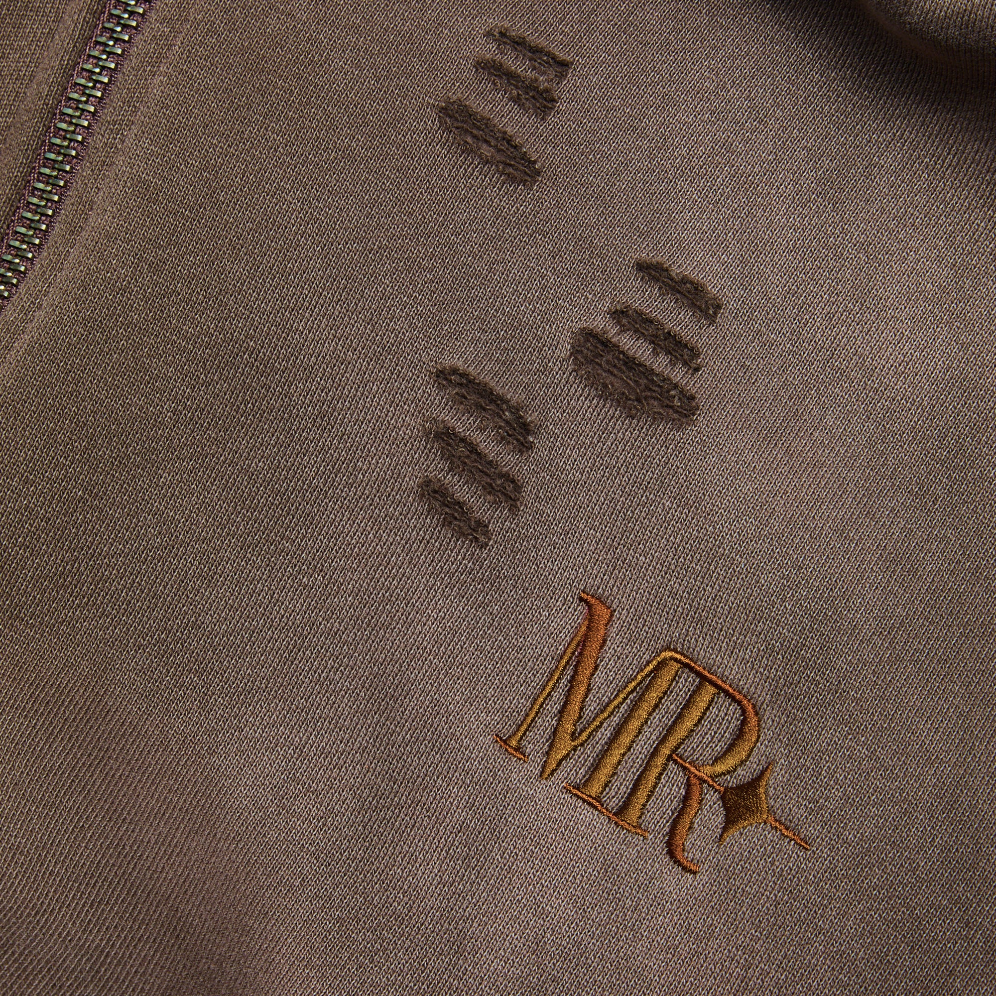 A full-zip hoodie rendered in a washed brown finish with subtle distressing throughout. The design blends classic casualwear with Midnight Rodeo’s worn-in Americana aesthetic, finished with tonal MR embroidery and a vintage fade that emphasizes the garment’s lived-in character.