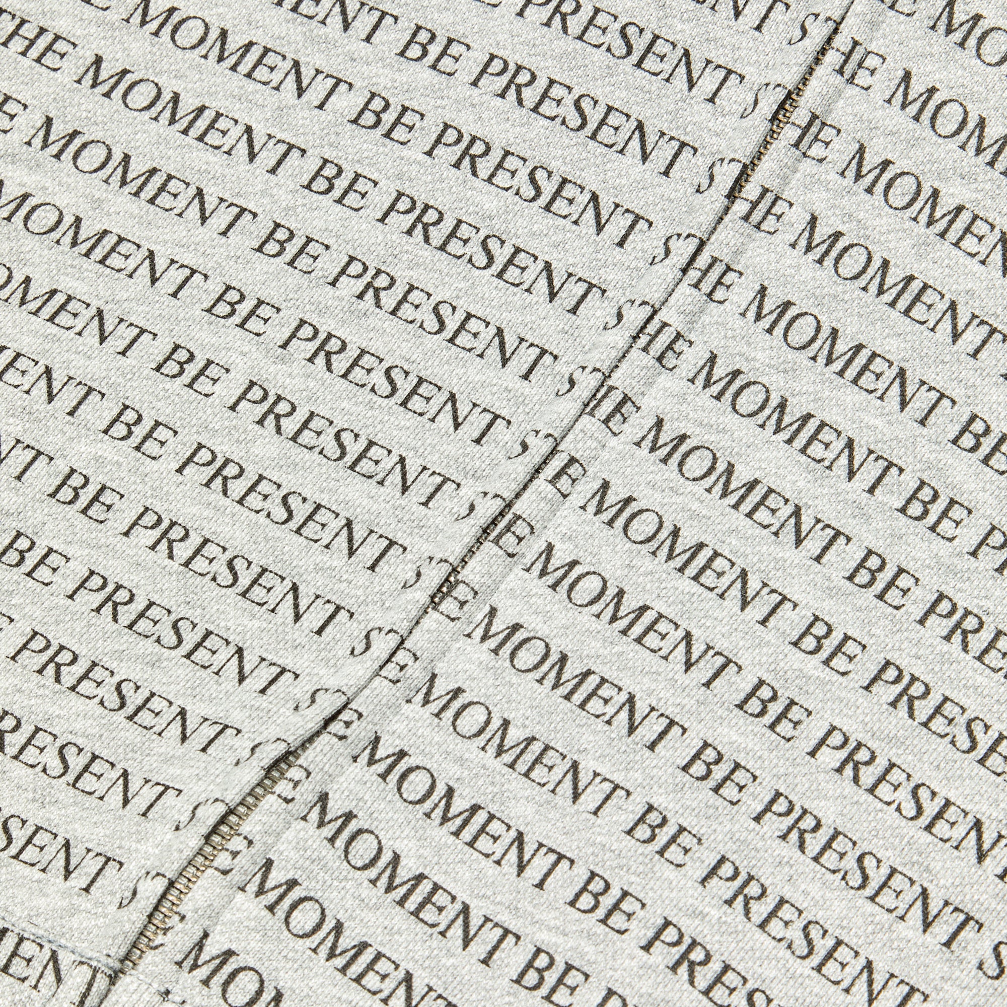 Finished in grey, this zip-front hoodie features an all-over typographic print across the body and sleeves. The repeated text creates subtle visual texture, adding depth without overpowering the design. A relaxed fit and classic hooded silhouette keep the piece easy and wearable, balancing graphic detail with everyday comfort.