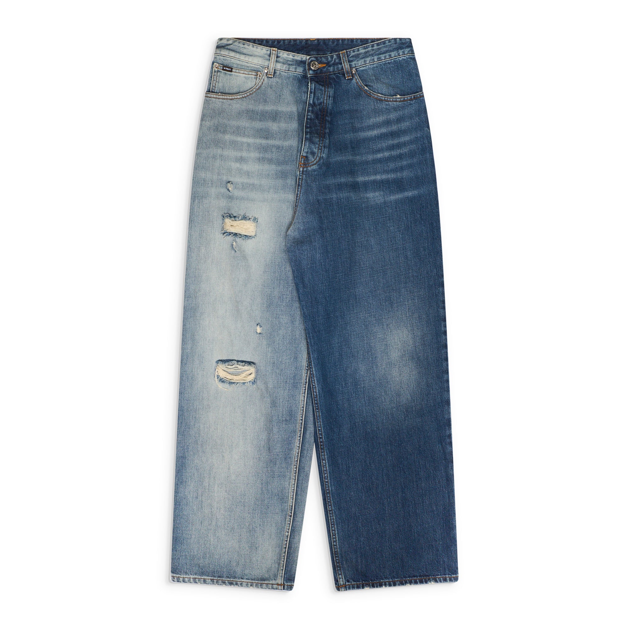 Classic five-pocket denim jeans featuring a faded degrade wash that transitions across the leg. The straight-leg silhouette and distressed detailing give the piece a worn-in look while keeping the construction clean and traditional.