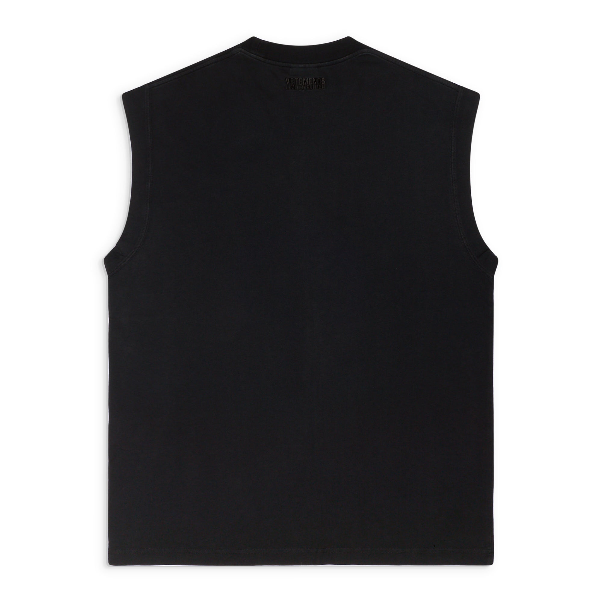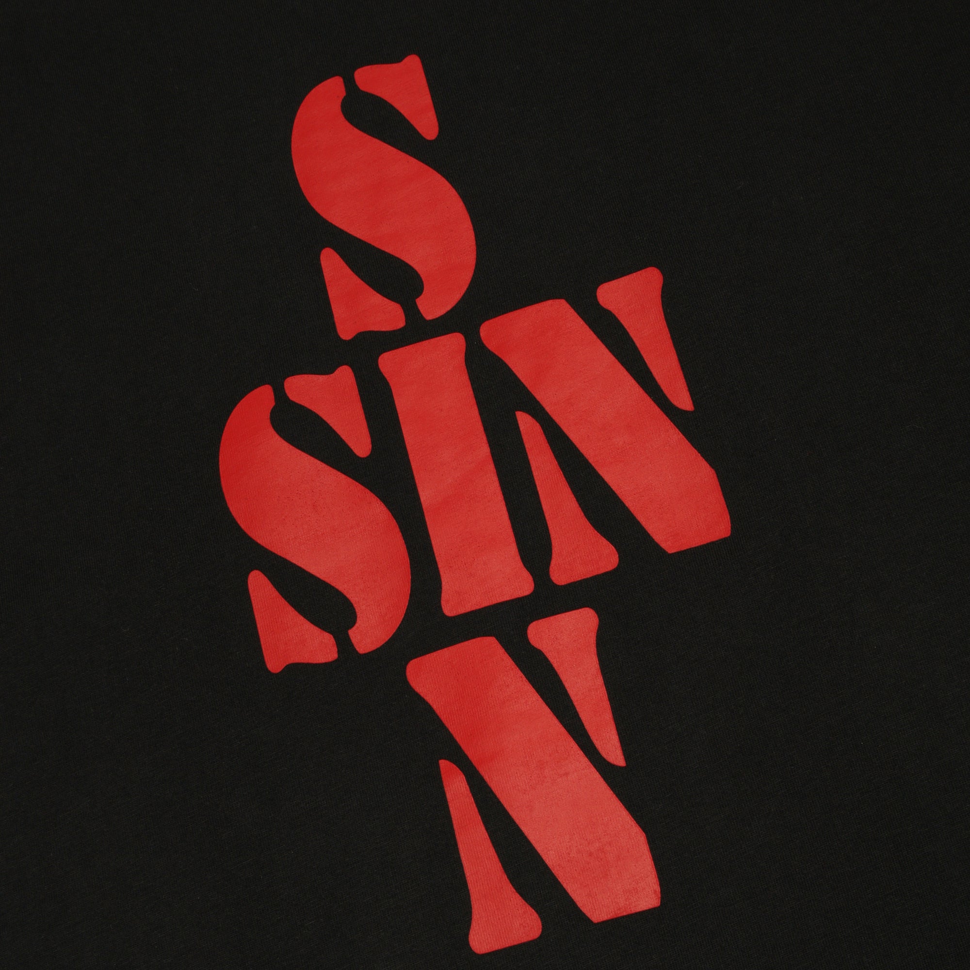 A sleeveless jersey top featuring VETEMENTS’ bold “SIN” text printed across the chest. Raw cut cap sleeves and a classic crewneck keep the silhouette simple while the graphic adds the label’s signature statement detail.