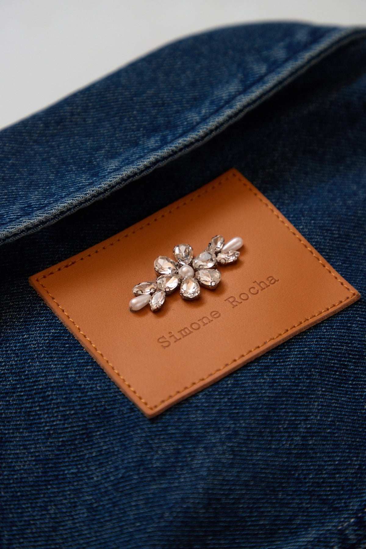 Simone Rocha’s signature glass-pearl embellishments embody the brand’s romantic refinement. On the belted Turbo jacket, they trace the collar with delicate precision, infusing the utilitarian cotton-denim silhouette with a touch of ethereal grace.
