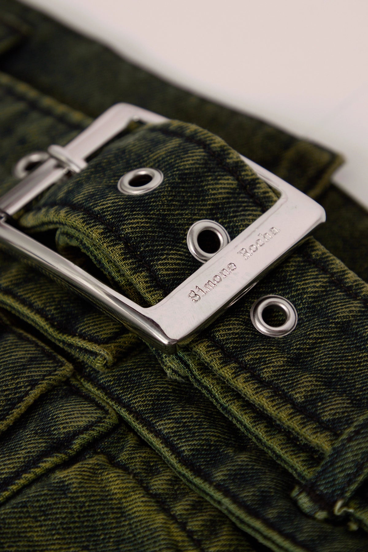 Multi Belt Waist Tail Denim Trucker Jacket W/ Emb Green