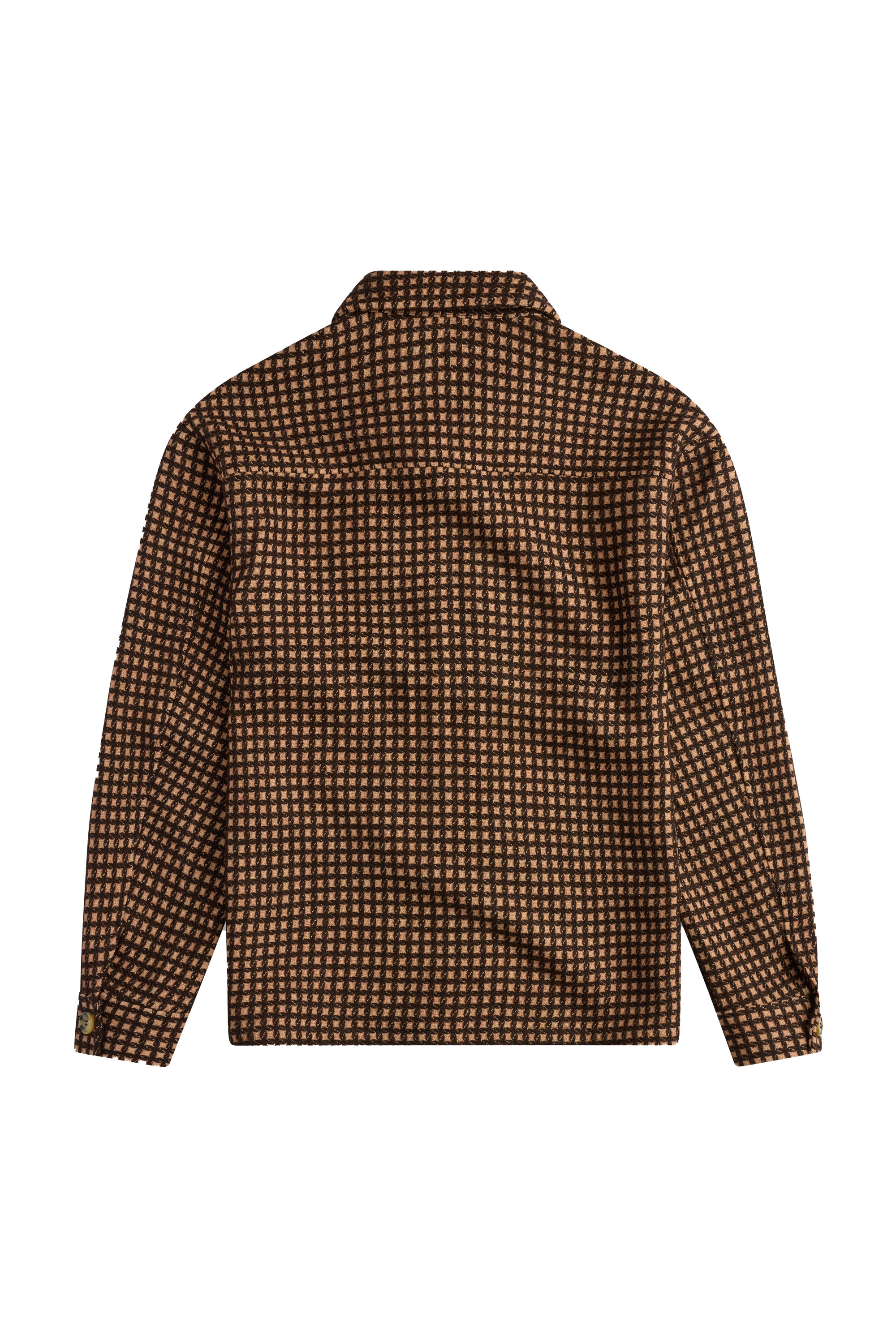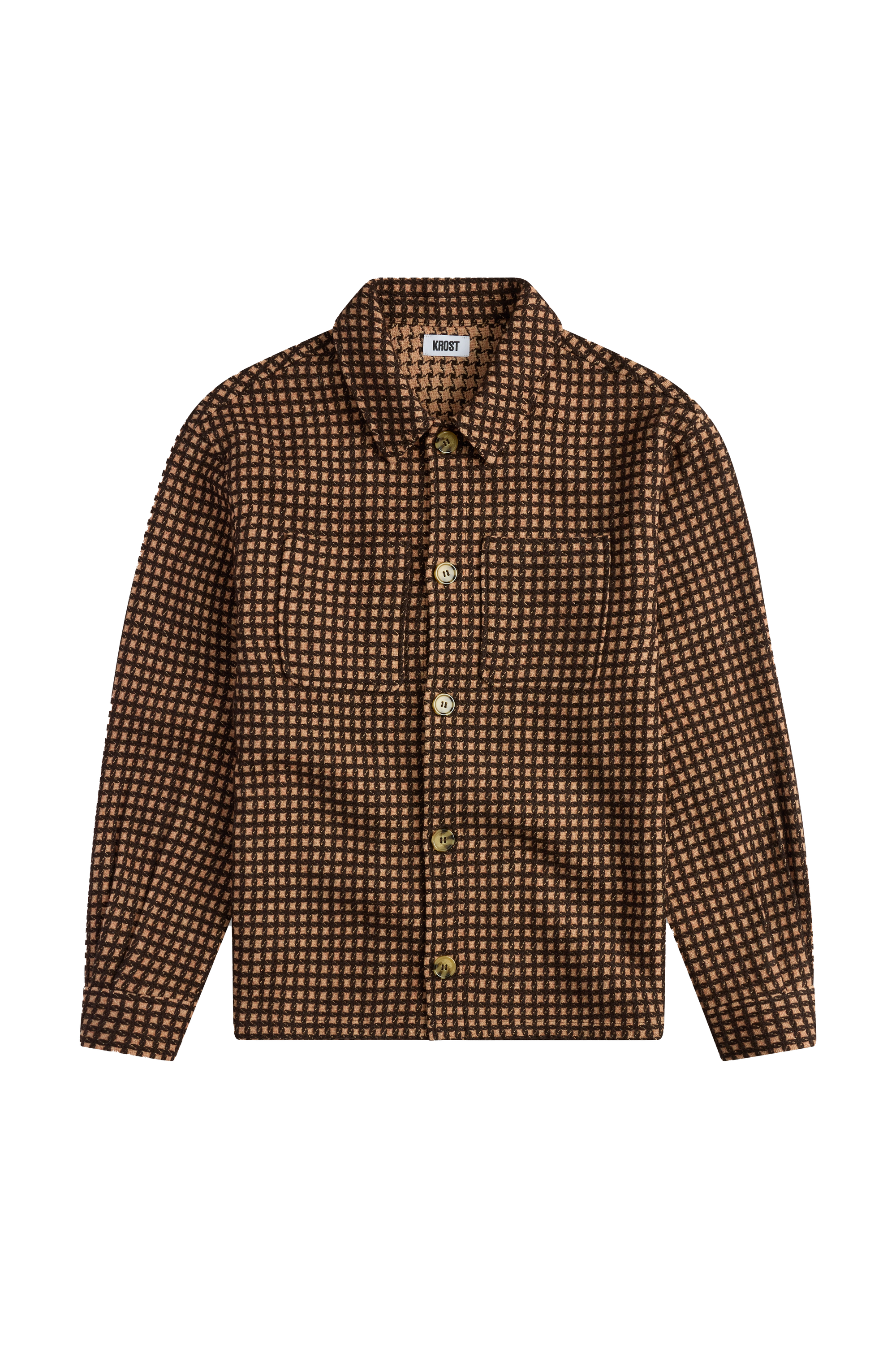 The Krost Wool Check Overshirt cut in a relaxed, boxy silhouette with a recycled wool blend construction features a point collar, dropped shoulders, dual chest patch pockets, and a straight hem, making it an essential layer in colder weather.