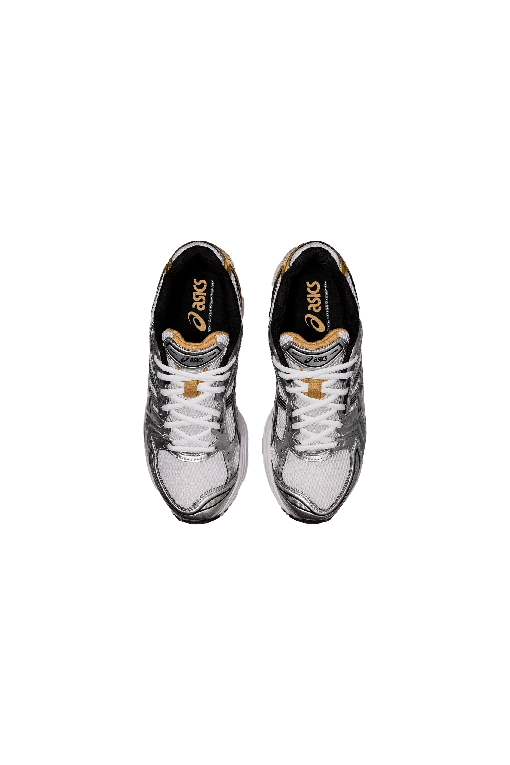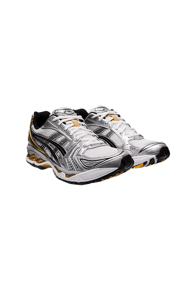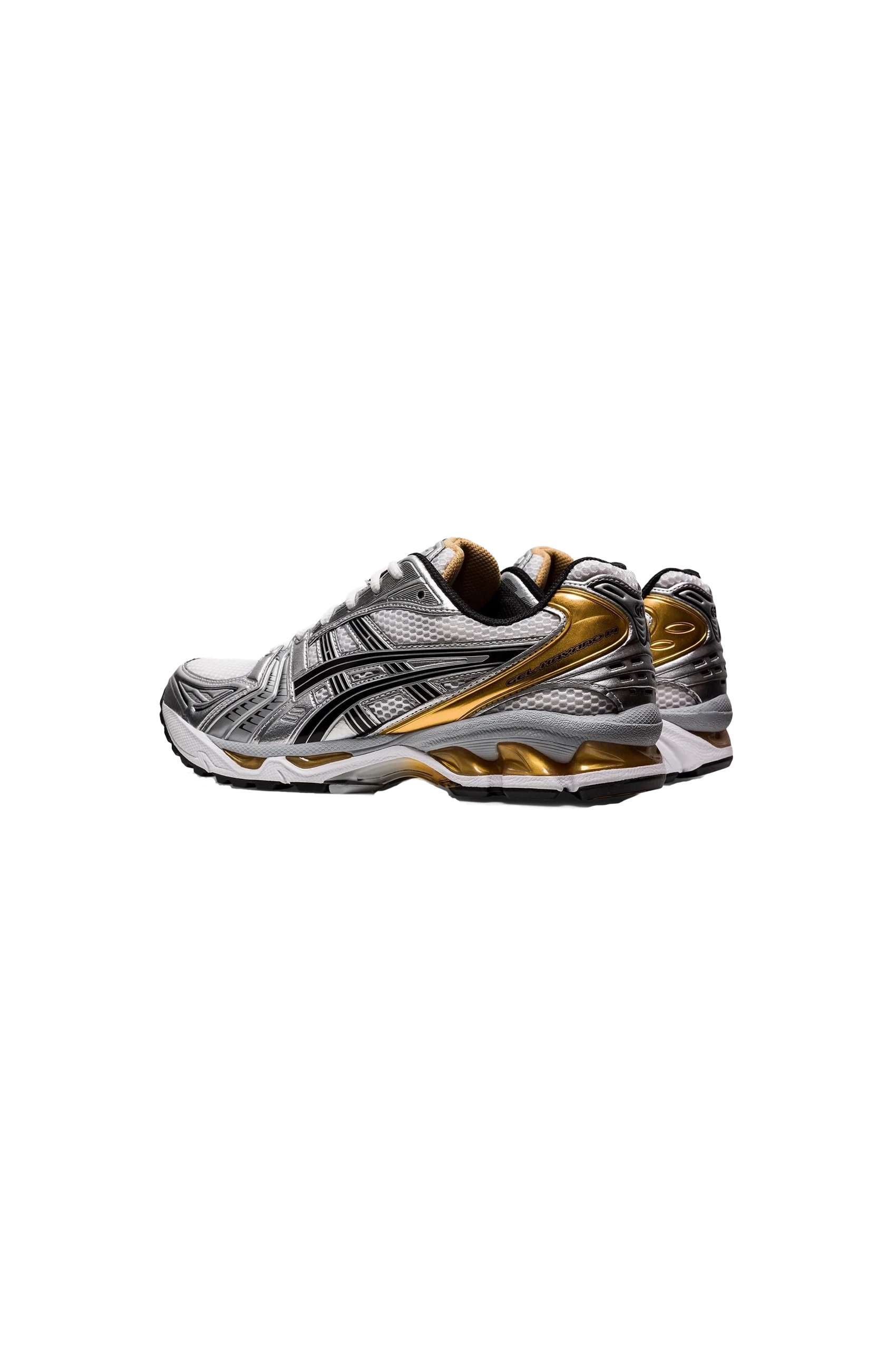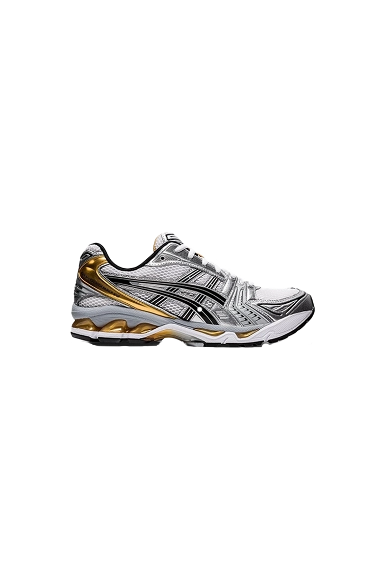 Asics Gel-Kayano 14 White/Pure Gold featuring a white and gold colorway, synthetic leather overlays, large pull tab on top of the tongue, Gel technology cushioning, and a lace up closure to complete the look.