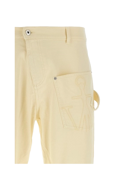 The JW Anderson Twisted Workwear Trousers in a medium weight denim twill fabrication featuring a relaxed fit, twisted silhouette, curved seams, a logo embossed leather patch at front, and front patch pocket with a graphic tonal anchor profile stitch.