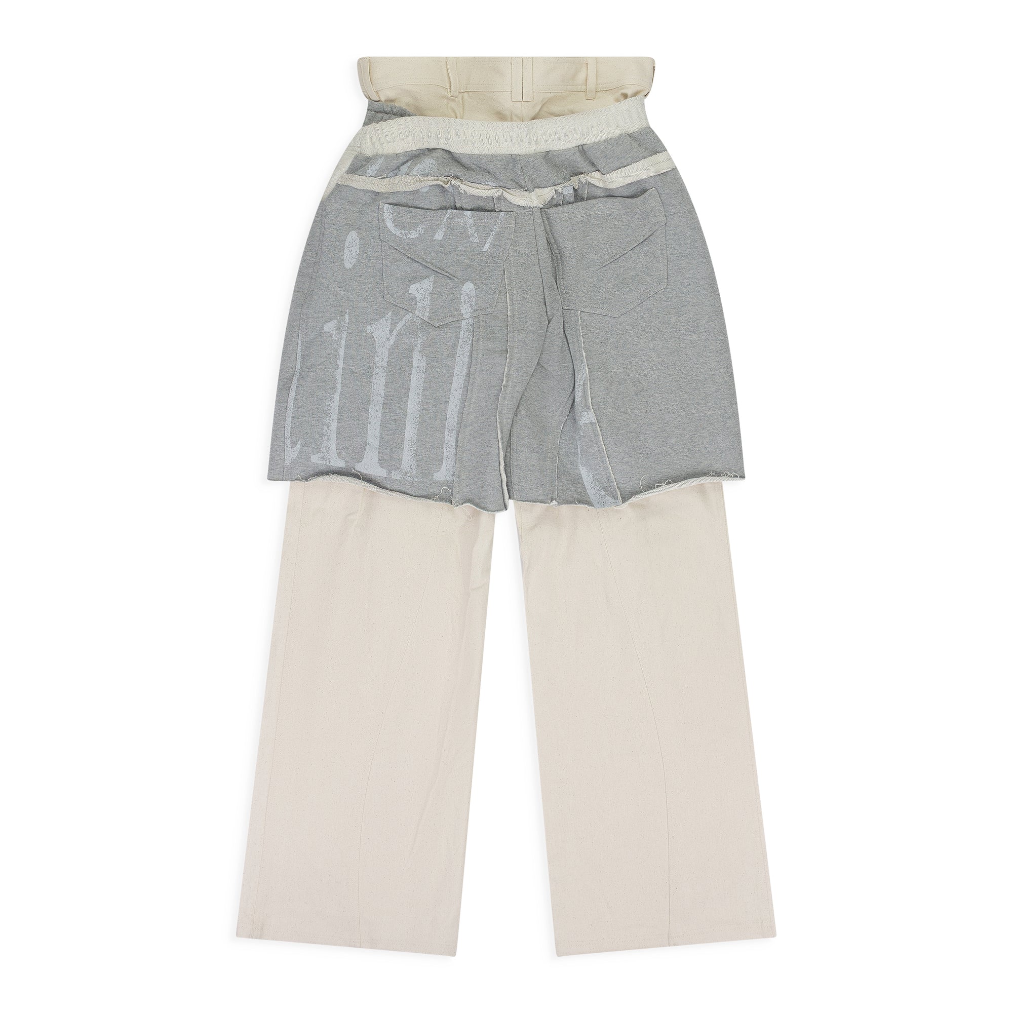 The Ahmad layered trousers explore hybrid construction through contrast and proportion. A tailored base is overlaid with a cropped sweatpant layer, creating a deliberate tension between structure and softness. Raw edges and exposed seam work emphasize the garment’s deconstructed nature, while the dual-waist effect reshapes the familiar trouser silhouette into something experimental yet balanced.