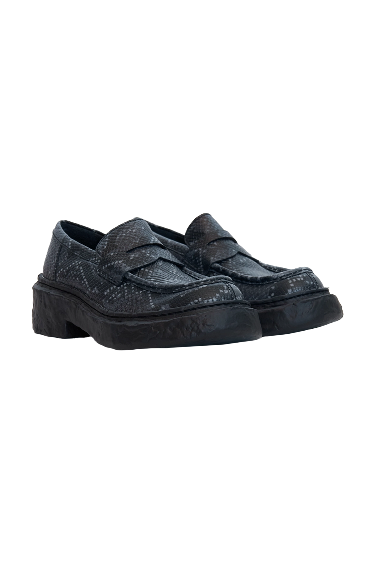 The Camper Lab Vamonos Printed Python Loafer with OrthoLite® Recycled™ footbeds, a moc toe, textured rubber block heel, and textured logo-treaded rubber sole. Heel: H2"