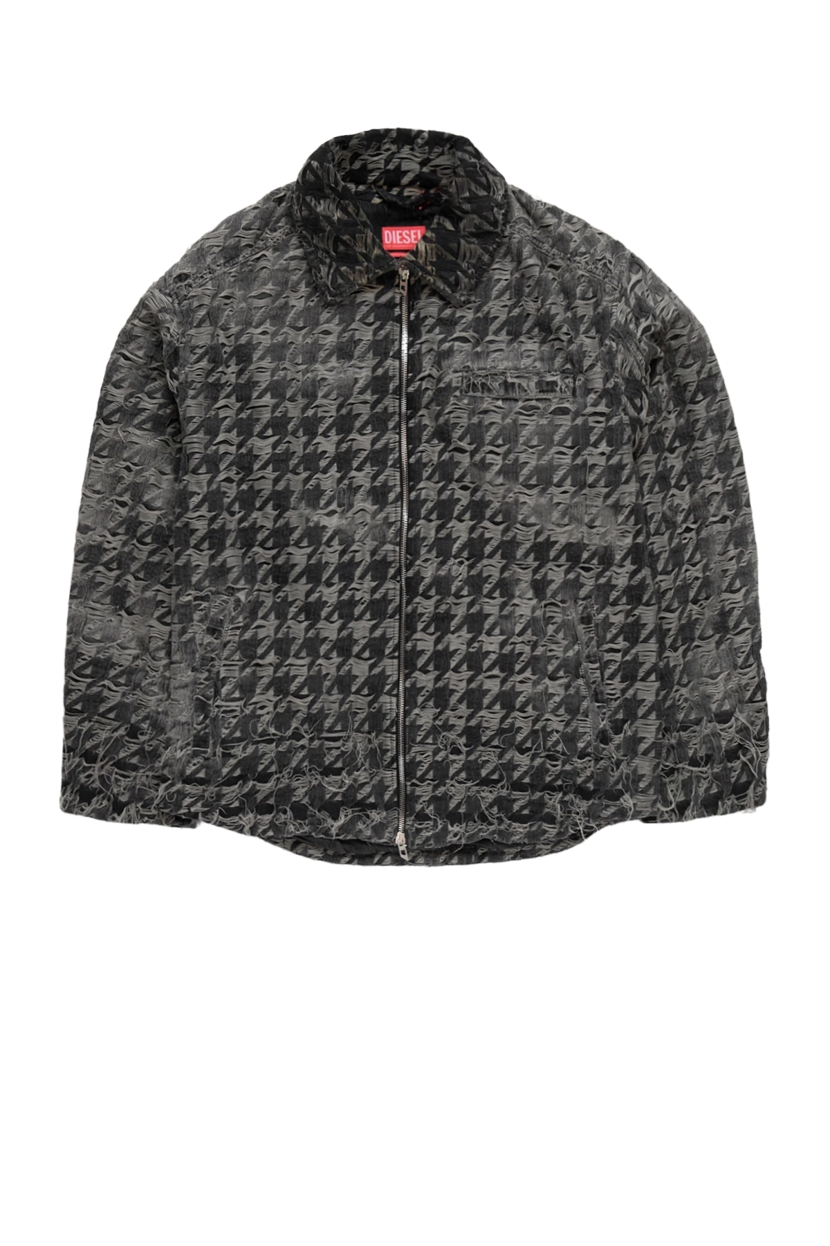 The Diesel Houndstooth Distressed Jacket seen on the runway is cut to a straight, relaxed silhouette with dropped shoulders in a distressed lightweight fixed denim finished with laser techniques and burn effects for a worn-in, one-of-a-kind texture. It features a two-way metal zip closure with “D” pullers, adjustable cuffs, a chest pocket, and side pockets. Lined.