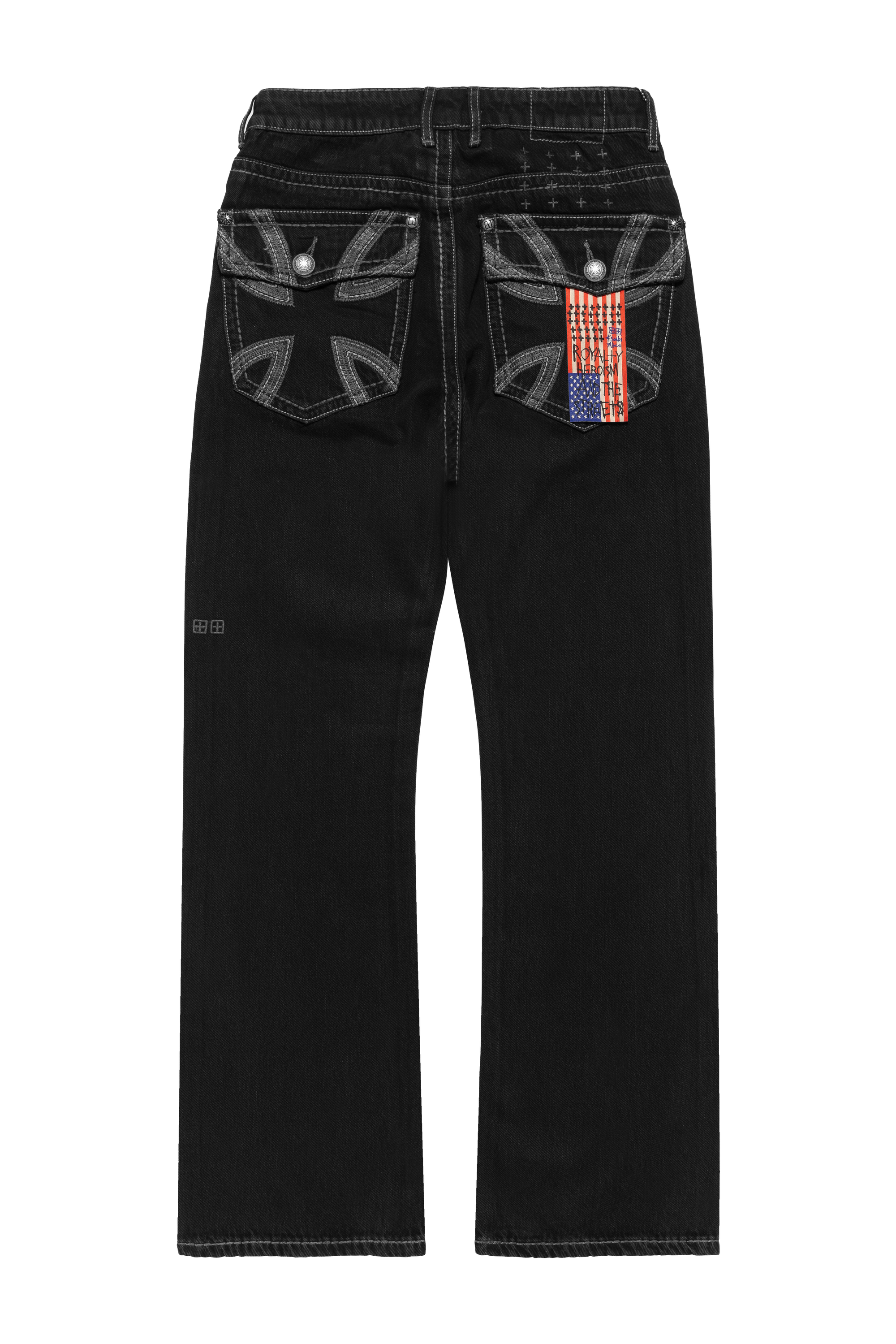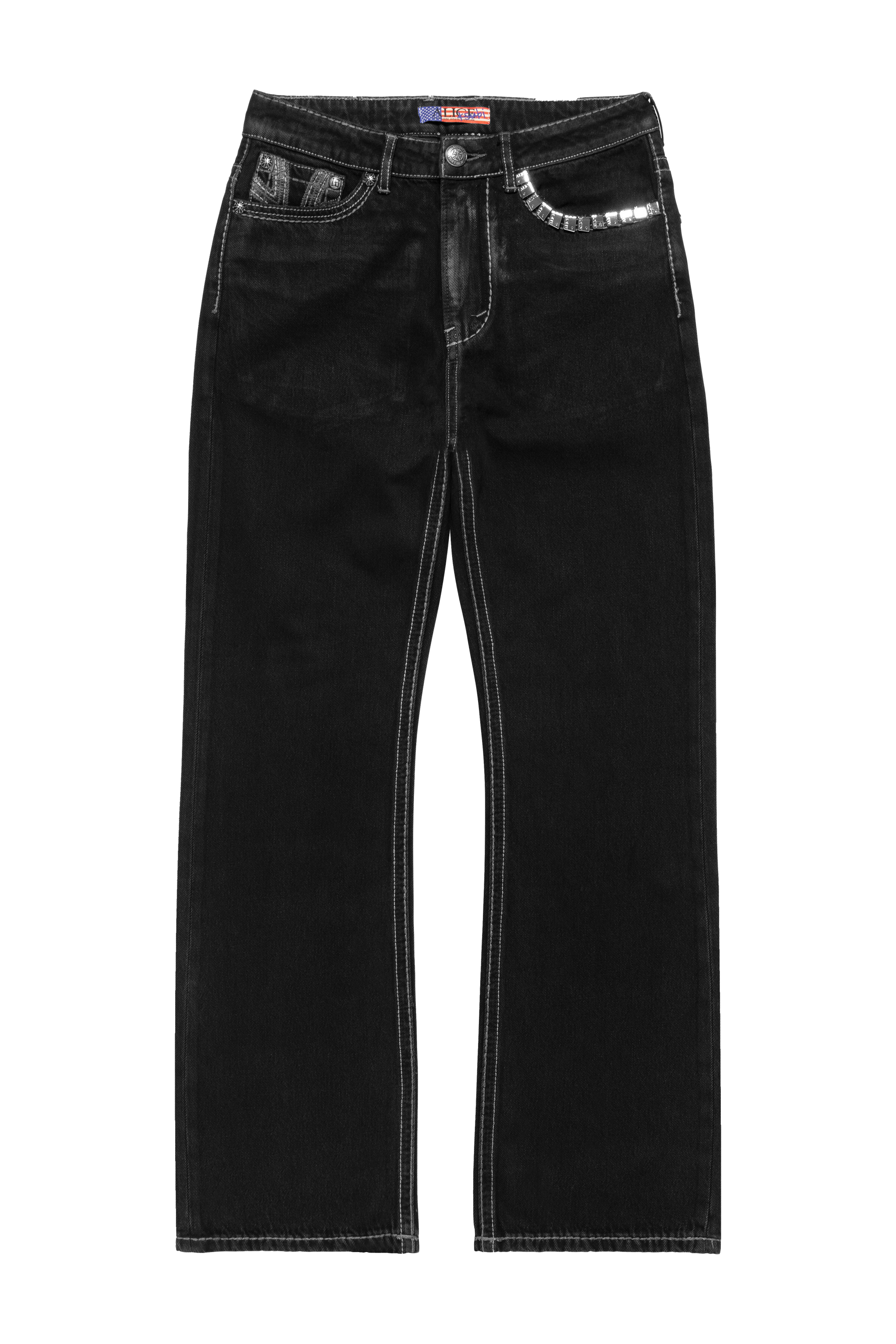 Ksubi X Alice Toro delivers a glazed, almost liquid leather effect in deep black—saturated, sharp, and uncompromising. Designed with a muted sheen, the coat features angular tailoring lines, exaggerated proportions, and gothic logo detailing that align with Alice’s visceral aesthetic.