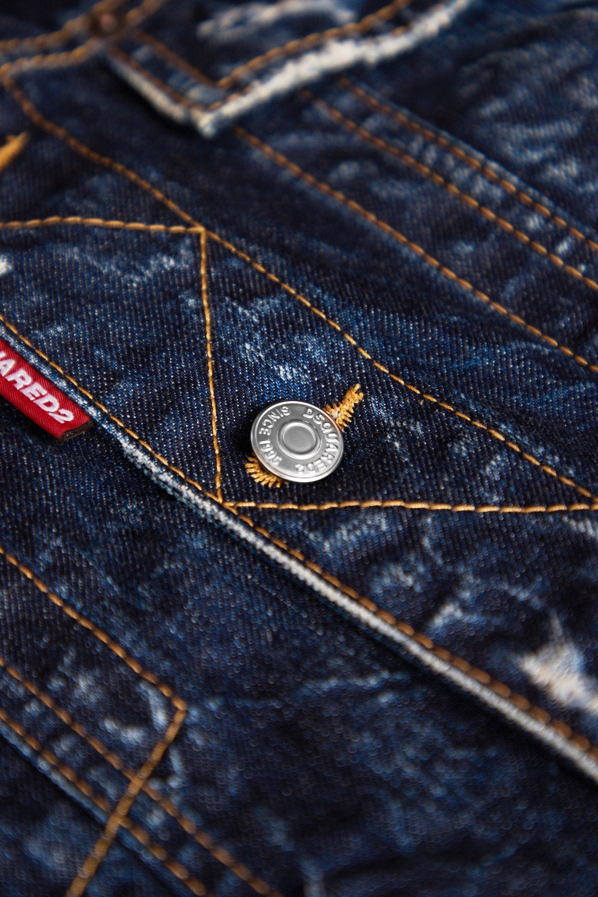 The Dsquared2 Aviator Hybrid Bomber combines a classic denim trucker jacket with aviator styling for a layered effect. The front and back feature distressed denim with contrast stitching, chest flap pockets, side pockets, a contrast logo flag at the placket, silvertone logo-engraved buttons, and a leather logo patch at the back collar. The inner layer in padded nylon boasts a slim fit, ribbed collar and cuffs, a utility pocket at the sleeve, and contrast quilted lining.