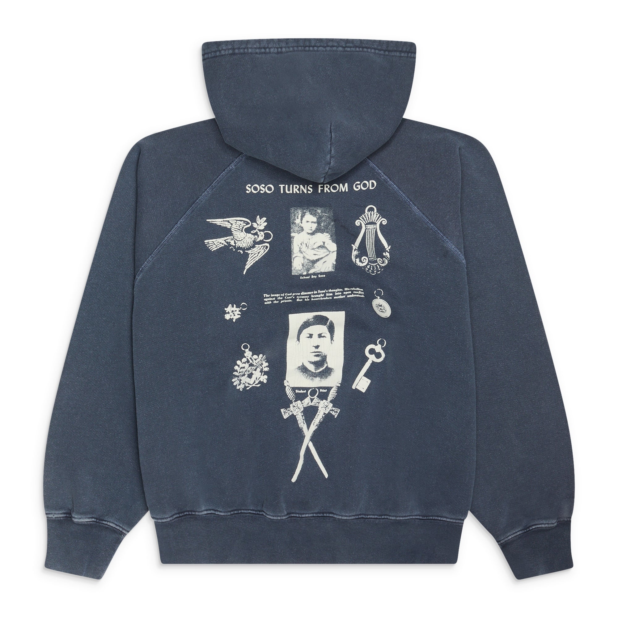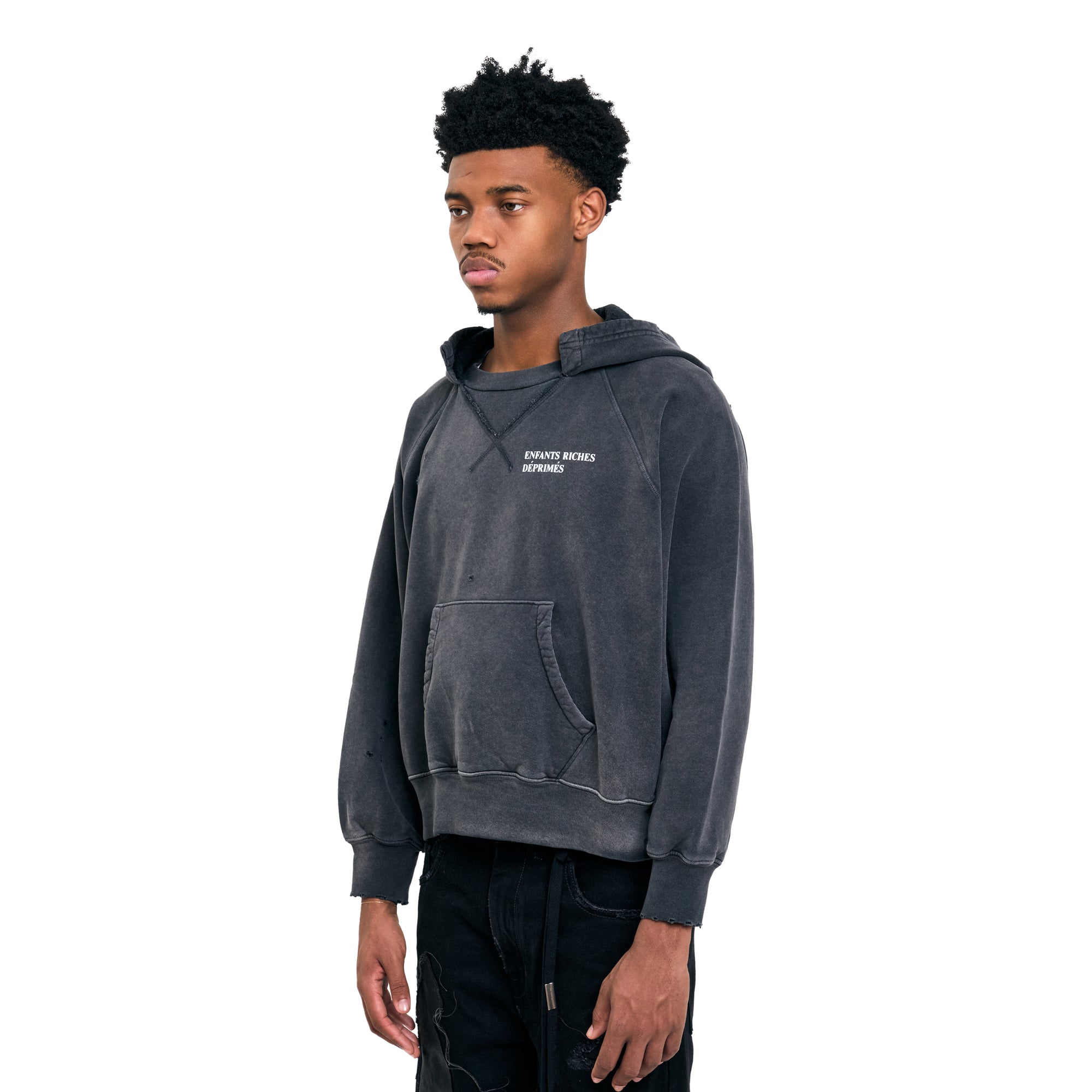 Enfants Riches Déprimés reinterprets the structure of casualwear with this Raglan Afterhood, fusing archival reference with utilitarian form. Contrasting panels and layered graphic application disrupt the familiar silhouette, underscoring the brand’s engagement with cultural detritus and fractured visual language. Treated surfaces and washed tones reinforce a sense of wear and memory, positioning the piece as a conduit between garment and narrative residue.