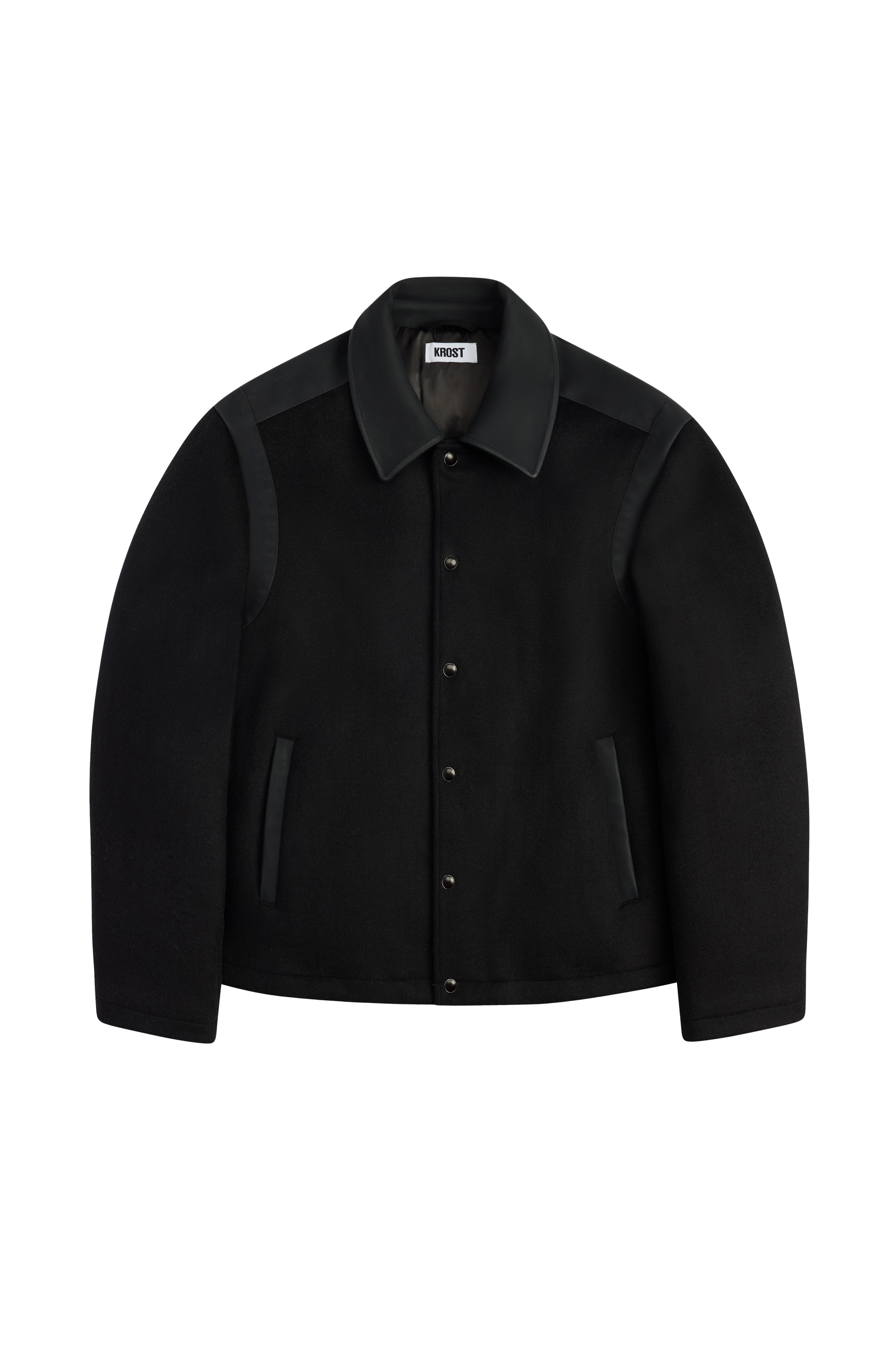 The Krost Mercer Varsity jacket crafted with a wool-blend body and faux leather panels at the collar, shoulders, and welt side pockets features contrast blanket stitching at the sleeves and center back seam, snap button closures, and insulated ribbed cuffs. Fully lined with an interior zip pocket for added functionality.