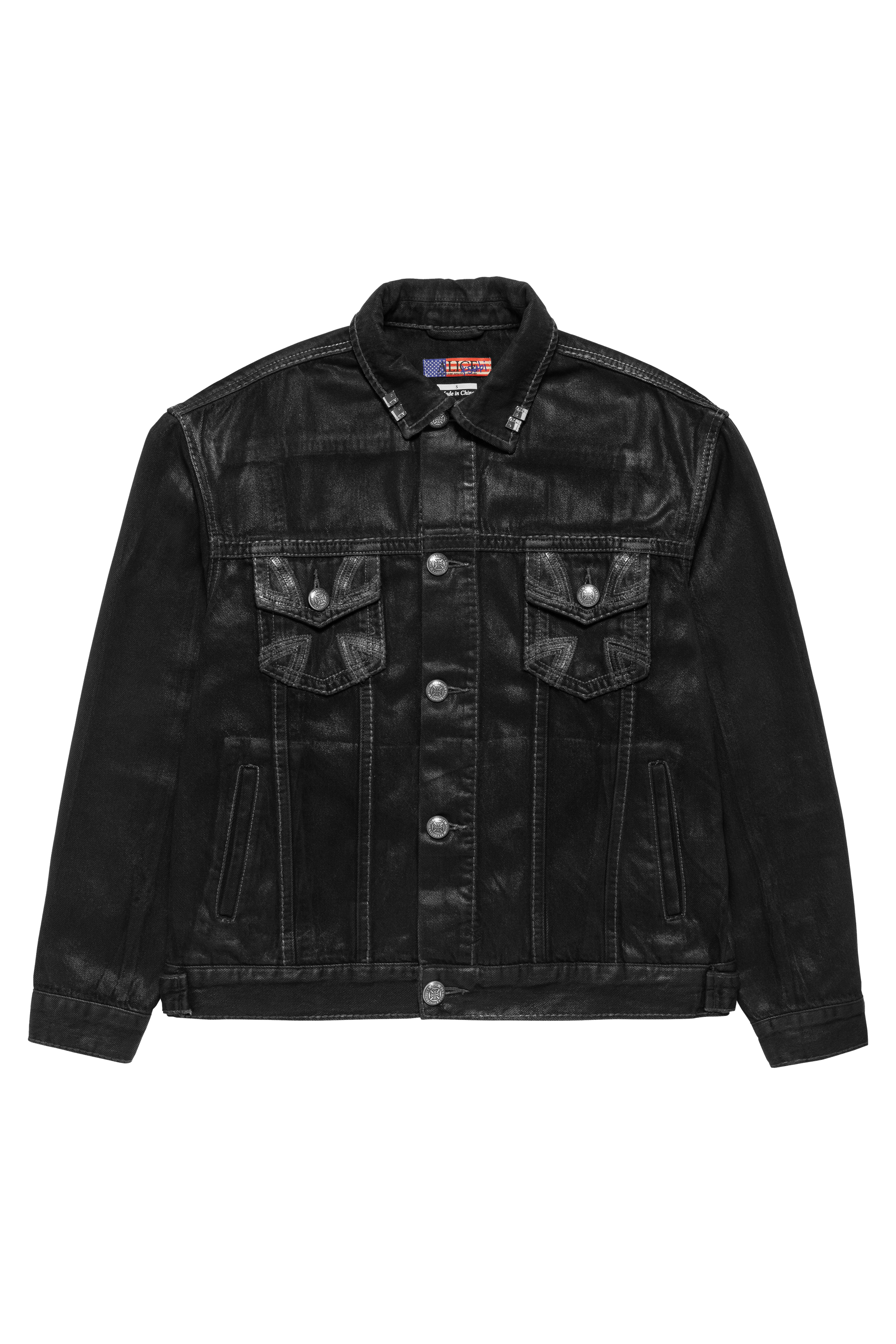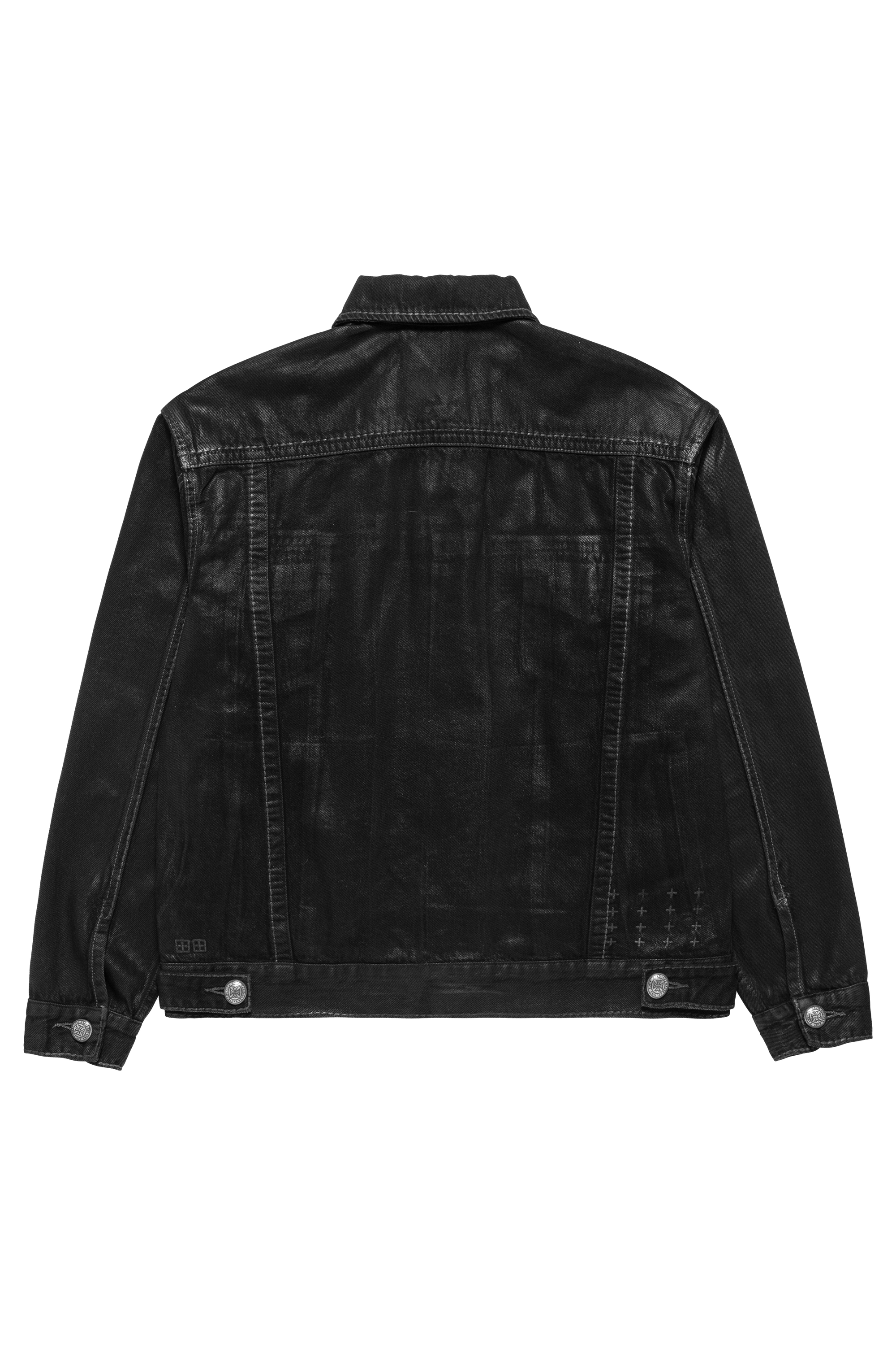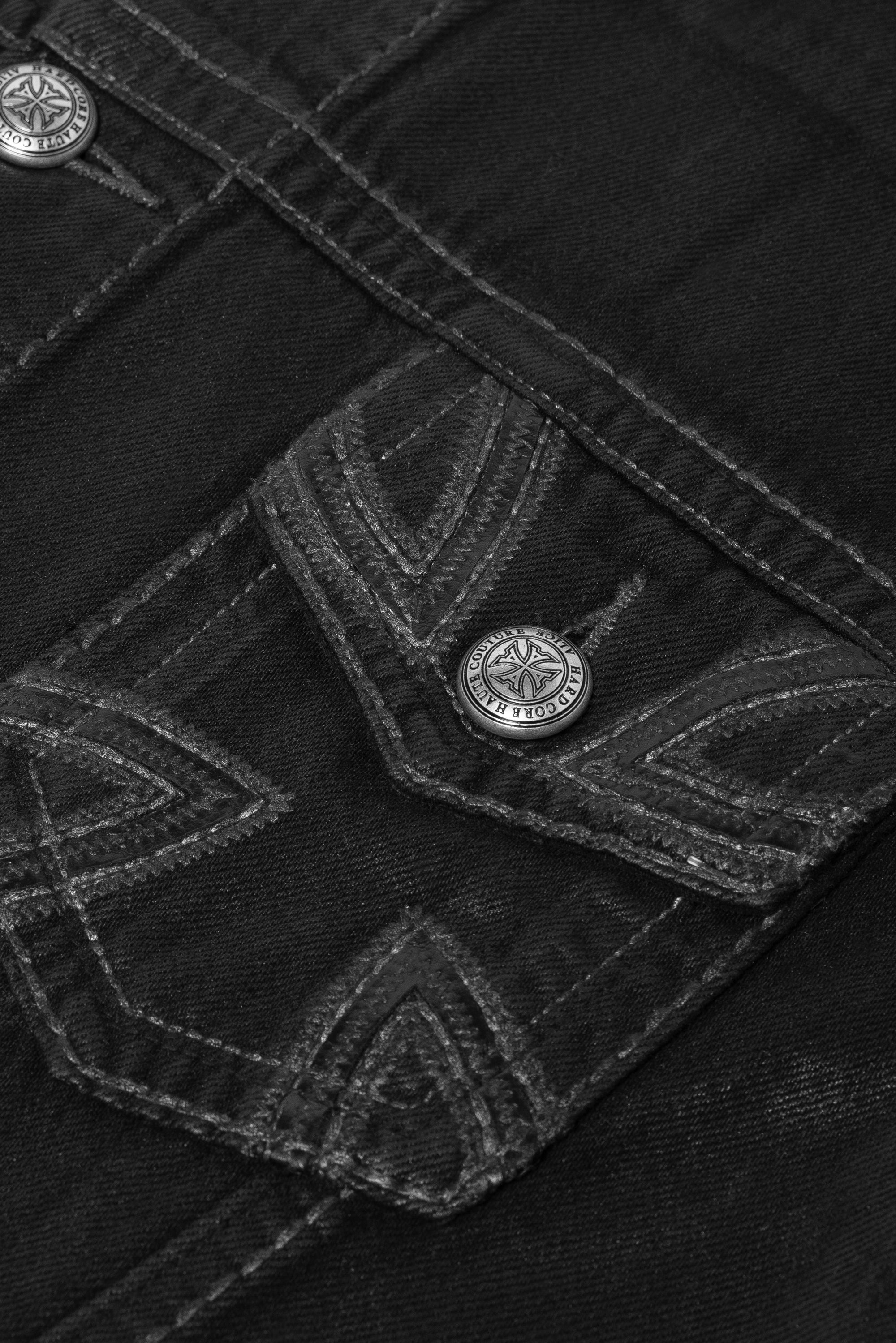 blends classic denim trucker structure with bold graphic artistry. Cut from rigid denim in a stone-washed indigo finish, it’s detailed with laser-cut leather appliqués around pocket edges, thick saddle-stitching, 4x4 cross embroidery, and T-box branding.