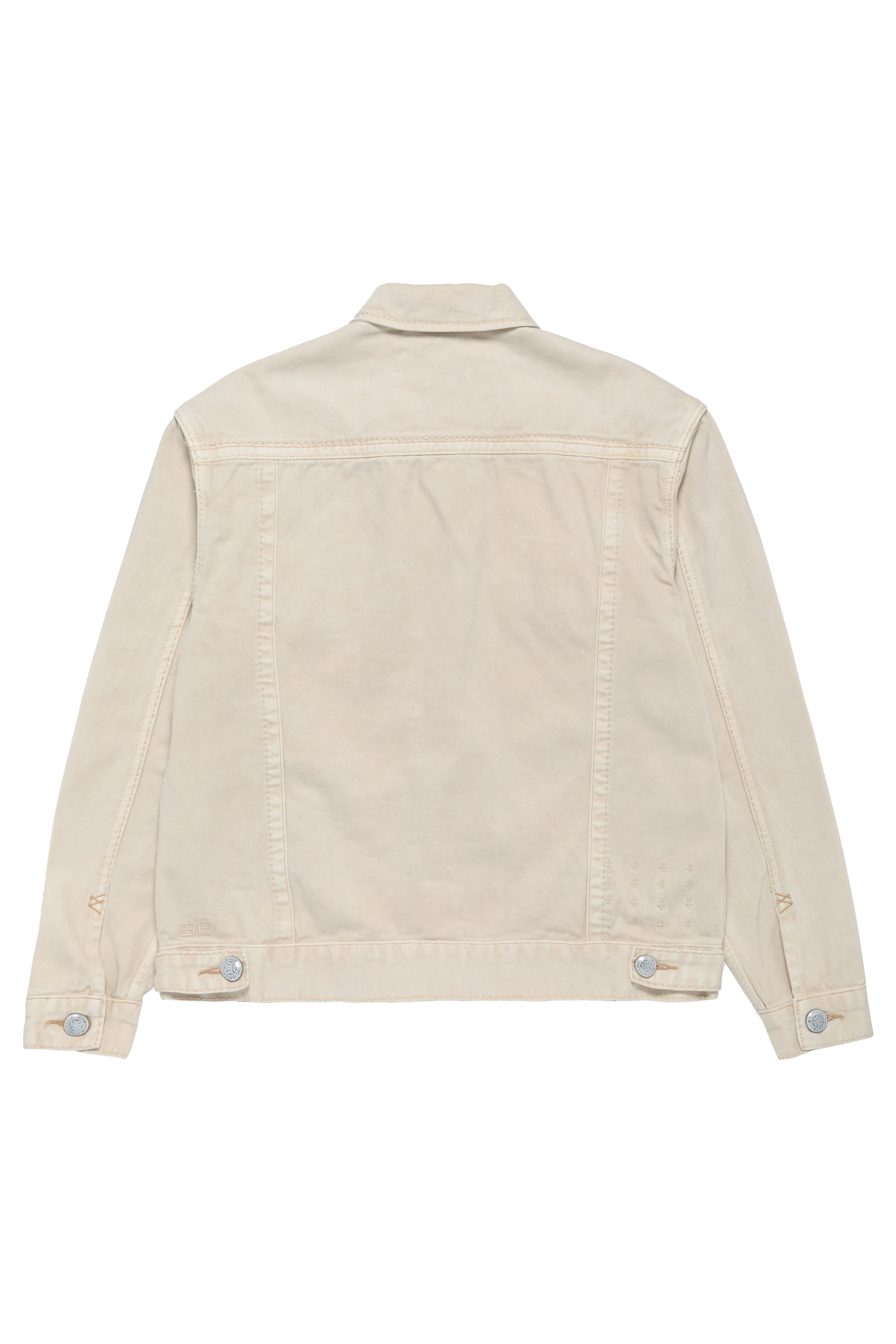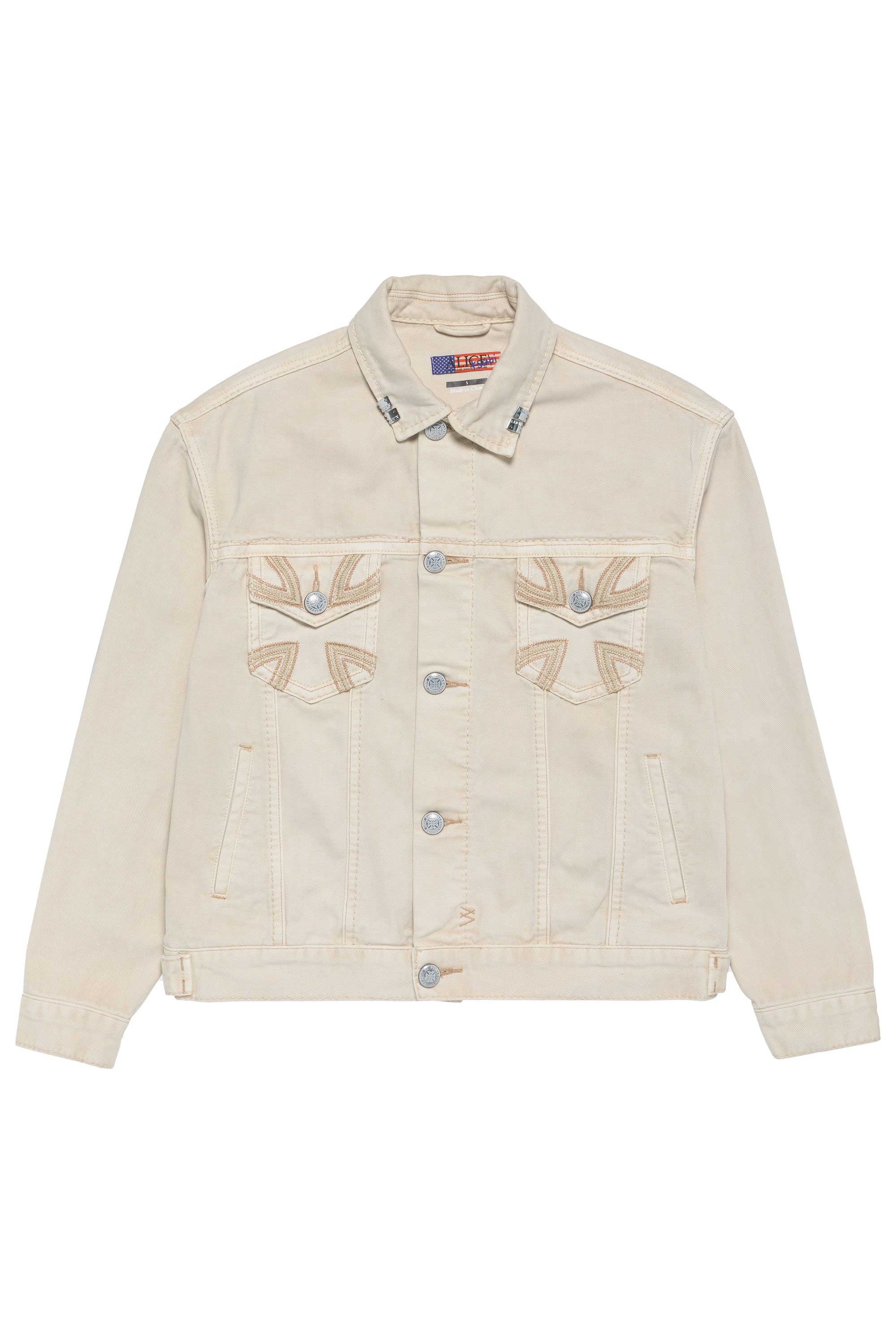 blends classic denim trucker structure with bold graphic artistry. Cut from rigid denim in a stone-washed indigo finish, it’s detailed with laser-cut leather appliqués around pocket edges, thick saddle-stitching, 4x4 cross embroidery, and T-box branding.