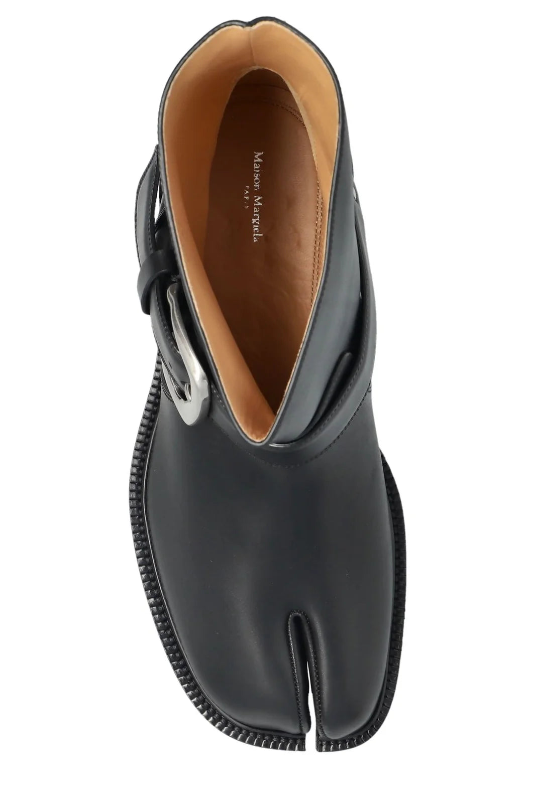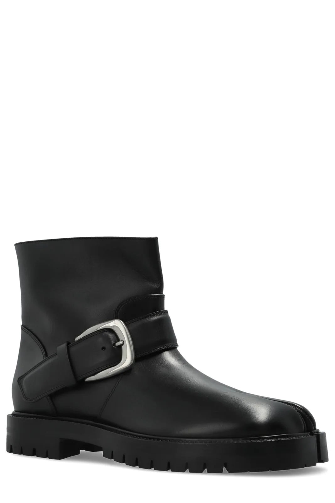 Margiela Tabi County Buckle Ankle Boots defined by Margiela's signature split toe and understated white back stitch. A silver-tone buckle strap cinches the upper, while the sturdy rubber sole and 4 cm heel deliver both polish and practicality. Refined minimalism with edge.