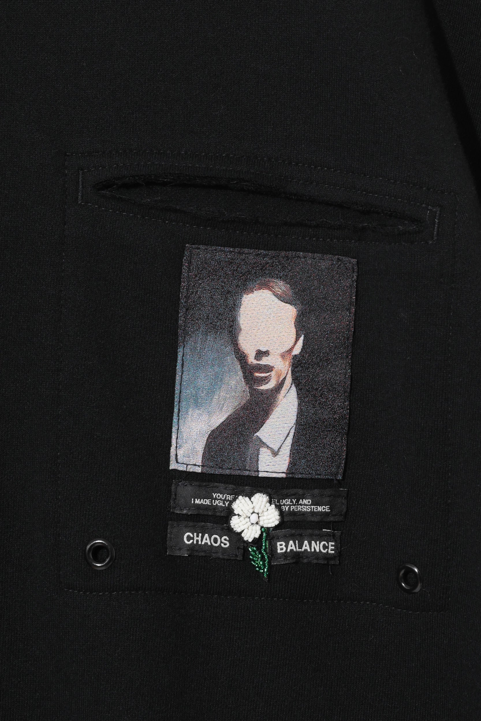 The Undercover Sweatshirt With Pockets in black is a relaxed-fit pullover in jersey featuring paneled construction, a crewneck, dropped shoulders, zipped side pockets, and a graphic patch and beaded floral embellishment at the chest pocket.