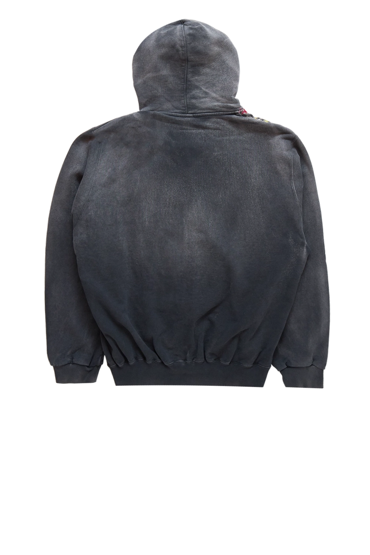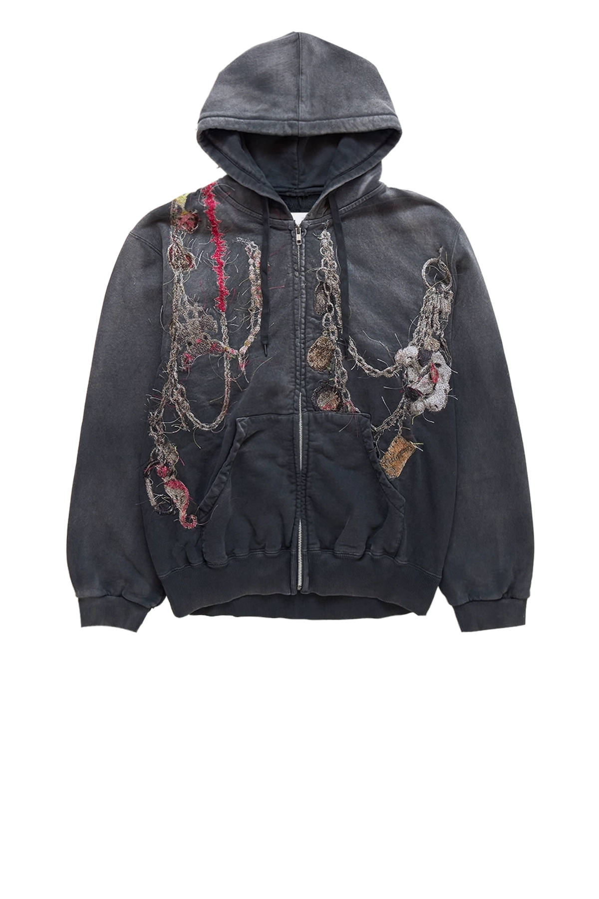 Doublet Embroidered Chain Zip-Up Hoodie featuring layered embroidered embellishments and frayed detailing. Designed with a hooded neckline, front zip fastening, and kangaroo pockets, it combines casual structure with statement detailing.