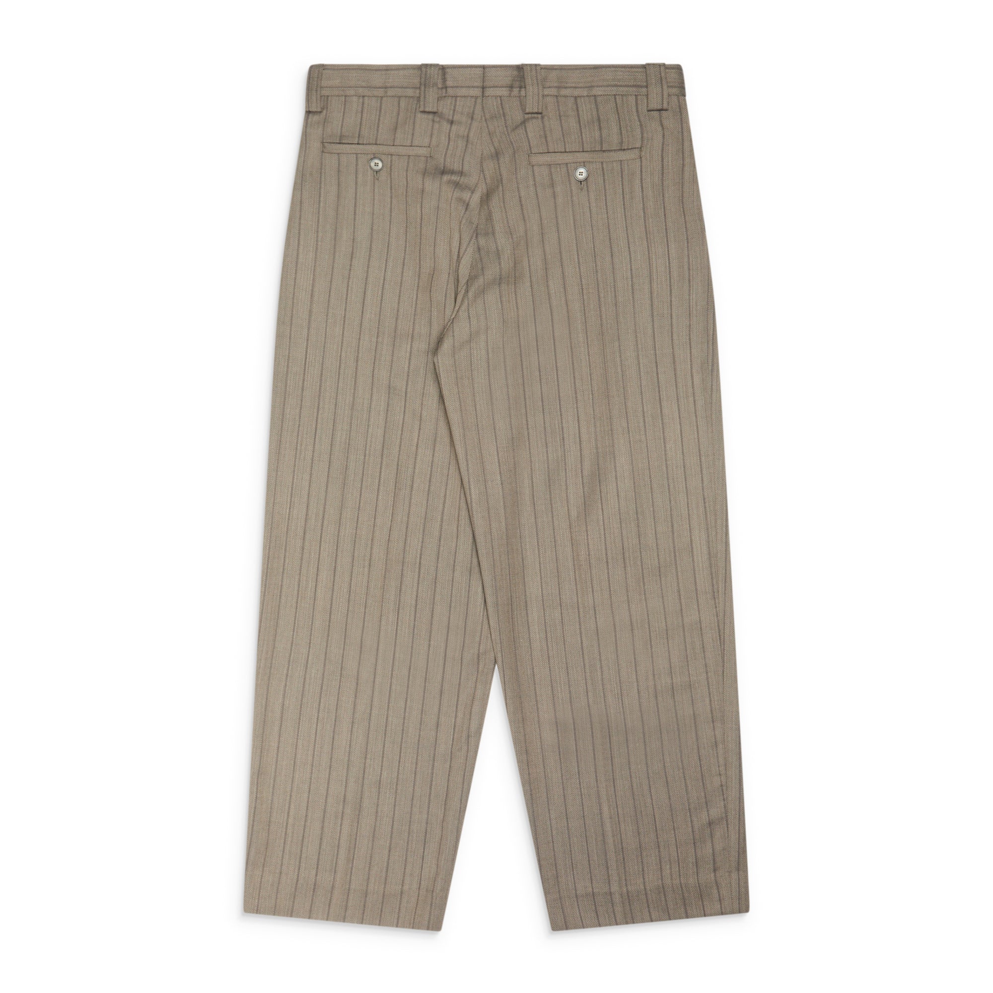 Tailored pinstripe carrot-leg trousers crafted from premium wool with a mid-rise silhouette, featuring a zip fly with offset button closure, belt loops, and welt pockets for a refined yet rebellious edge.