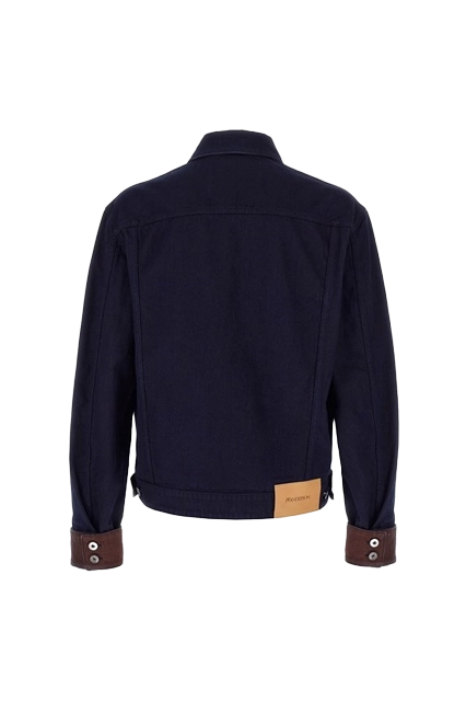 The JW Anderson Turn Up Cuff Denim Jacket featuring a boxy fit, contrasting turn-up cuff detailing, flap chest pockets, side pockets, and logo embossed raw leather patch at the back hem.