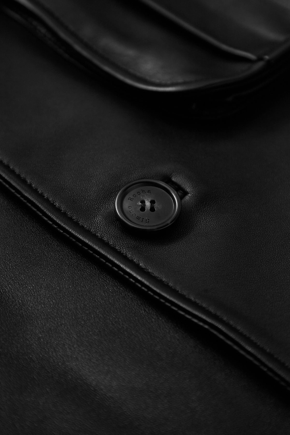 Simone Rocha Multi Pocket Car Coat featuring three-dimensional utility cargo pockets at the front for a workwear look. This longline style leather jacket has a relaxed fit perfect for layering.